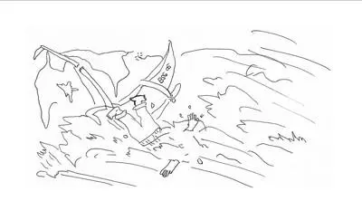 Because of the strong wind, his boat goes upside down. Then he fells down the sea.